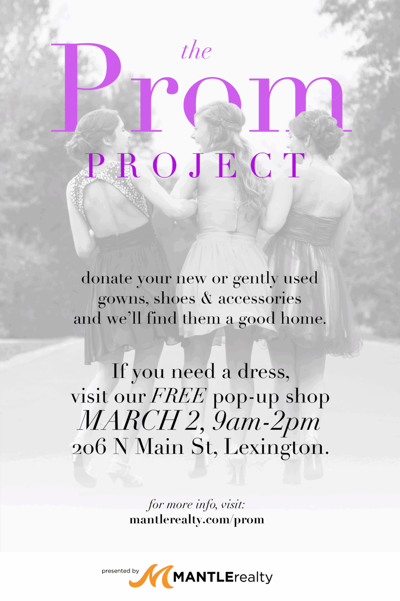 Ashley Weitzel created this initiative to improve one of the biggest high school nights for students throughout Davidson County. She saw a need and organized a prom collection drive to ensure that no students missed out on the prom experience. Mantle Realty will be collecting gowns, shoes, and accessories at our location across from North Davidson High School. All donations are appreciated beyond measure.